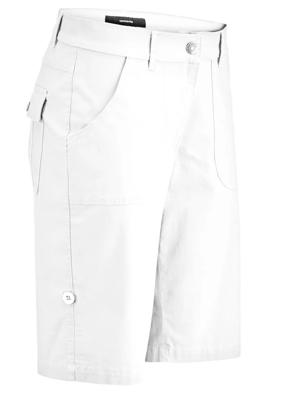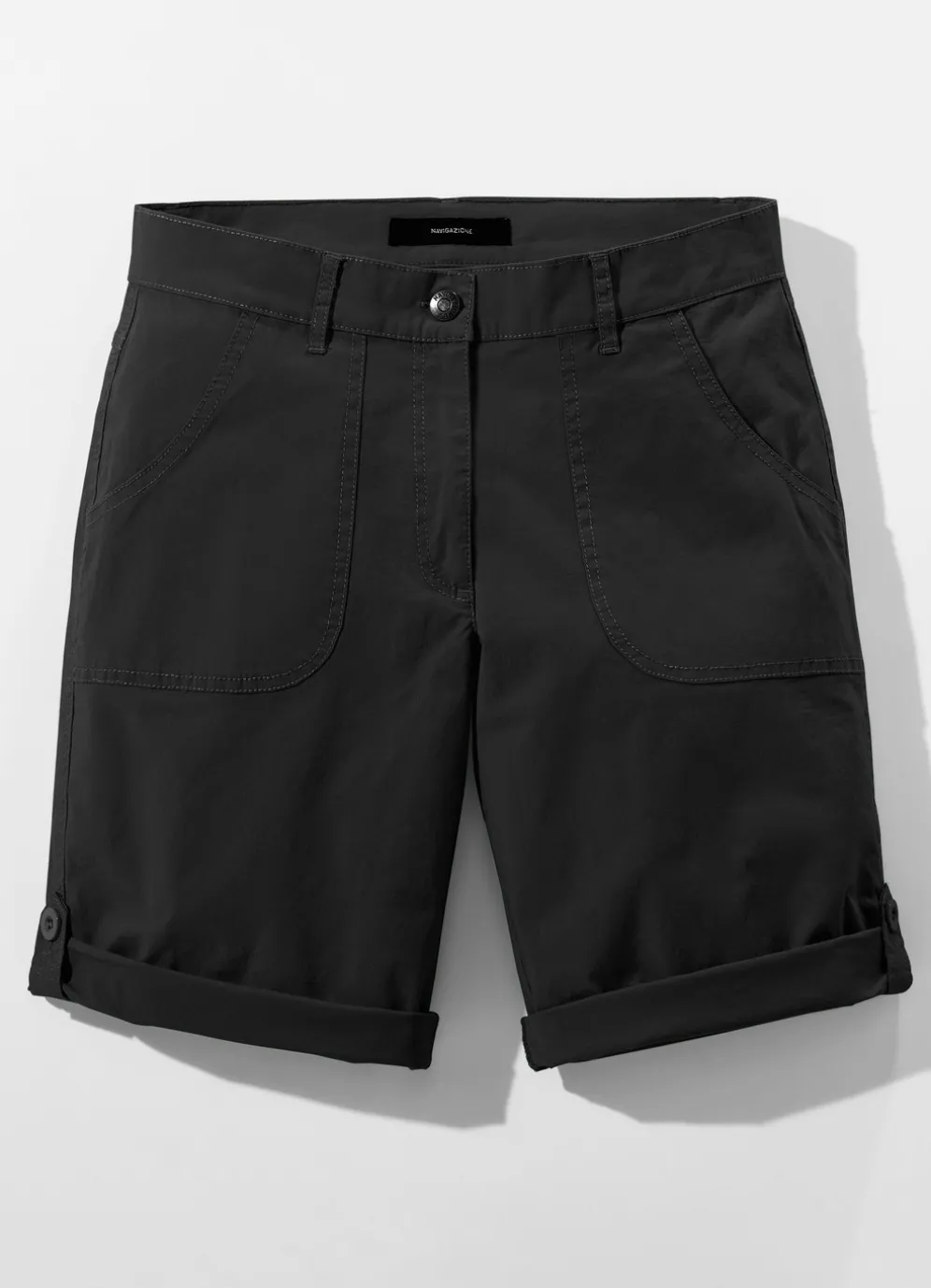 Sportive, krempelbare Bermudas mit Zierriegel: elastischer Formbund, Gürtelschlaufen, Knopf- und Reißverschluss, Seitentaschen mit Ziersteppungen, aufgesetzte Gesäßpattentaschen mit Druckknopf und Ziersteppungen sowie figurformende Passe im Rückteil. Innenbeinlänge ca. 28 cm.