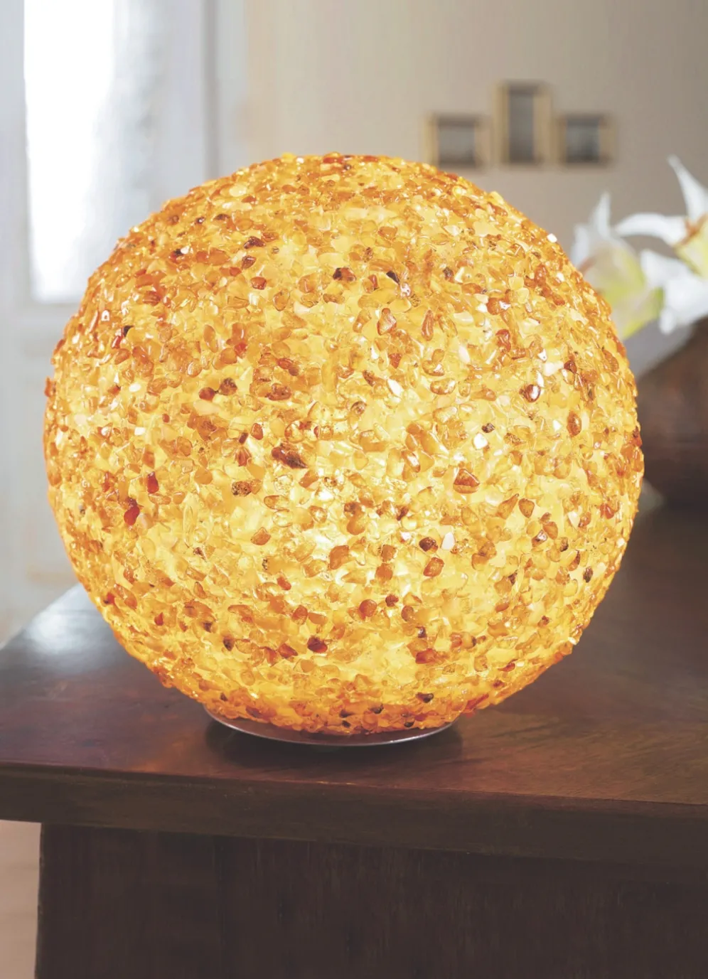 Diese fantastische Leuchte erzeugt ein schönes, warmes Licht durch Hunderte echter, von Hand verlesener, getrommelter und polierter Bernsteine. Sie wurden auf mundgeblasenem Glas angebracht. Aus deutscher Herstellung. 230 Volt, max.15 Watt, Fassung E14, Zuleitung 1,1 m, mit Schnurzwischenschalter. Leuchtmittel im Lieferumfang enthalten.