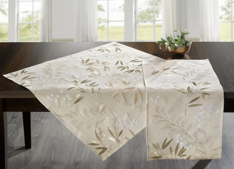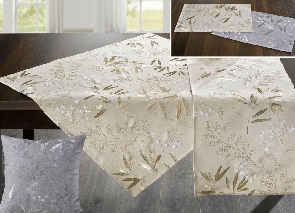 Bestickte Tisch- und Raumdekoration mit Gräser- und Blätter-Dessin in Größe 135 (Läufer, 35x 70 cm) und in Beige.
