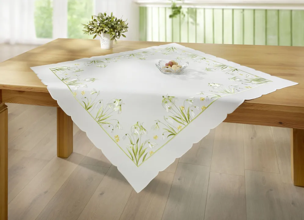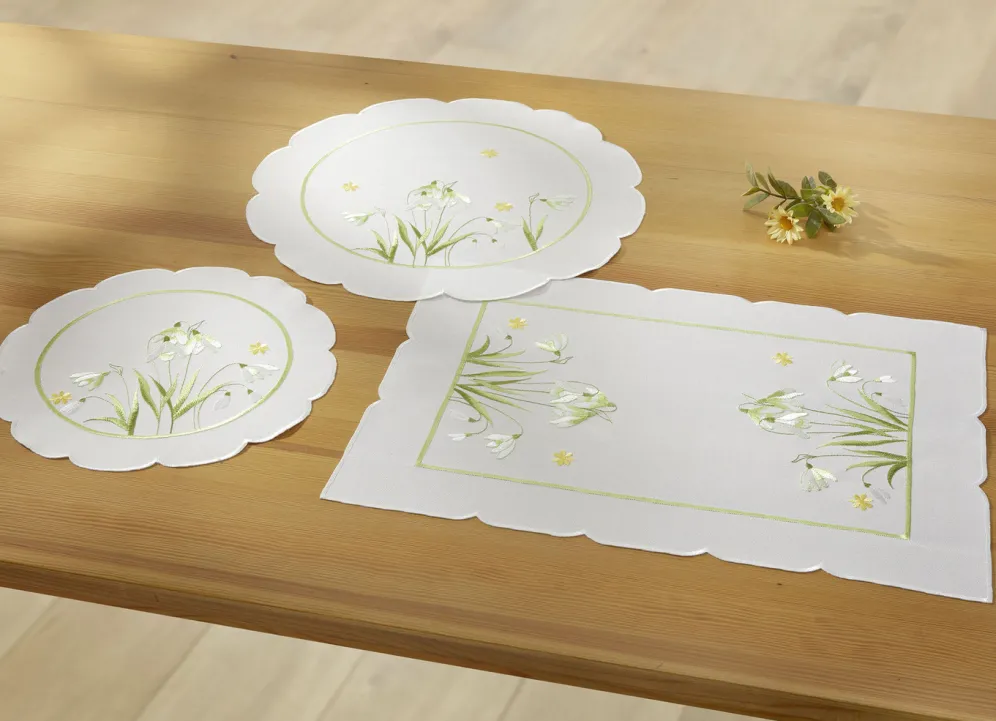 Bestickte Tisch- und Raumdekoration mit Schneeglöckchen-Dessin