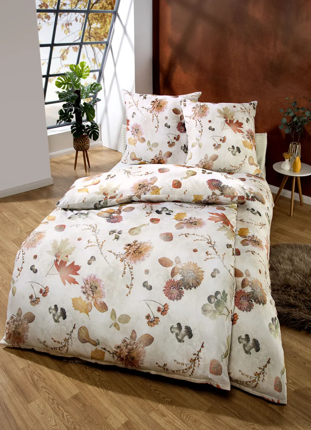 Das stimmungsvolle Herbstlaub-Dessin dieser beidseitig digitalbedruckten Bettwäsche-Garnitur