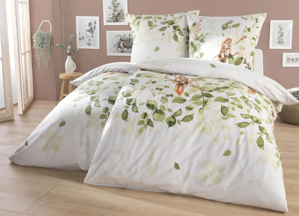 Diese schöne Bettwäsche-Garnitur von „Kaeppel“ zeigt ein niedliches Eichhörnchen, das sich zwischen Ästen und Blättern wohlfühlt. Mit praktischem Reißverschluss. Die Qualität: Feinbiber aus 100% Baumwolle. Waschbar bis 60 °C und trocknergeeignet.