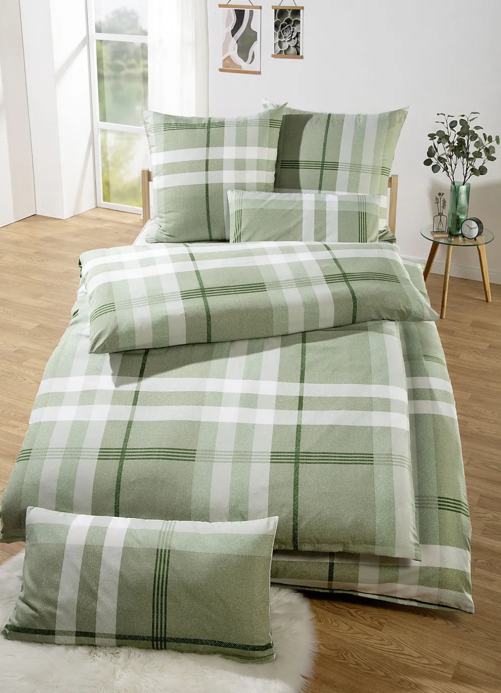 Die beidseitig bedruckte Bettwäsche-Garnitur von „Florella“ lädt mit ihrem Karo-Dessin und dem angenehm dezenten Grünton zum Träumen ein. Mit praktischem Reißverschluss. Die Qualität: Microfaser aus 100% Polyester. Waschbar bis 60 °C und trocknergeeignet