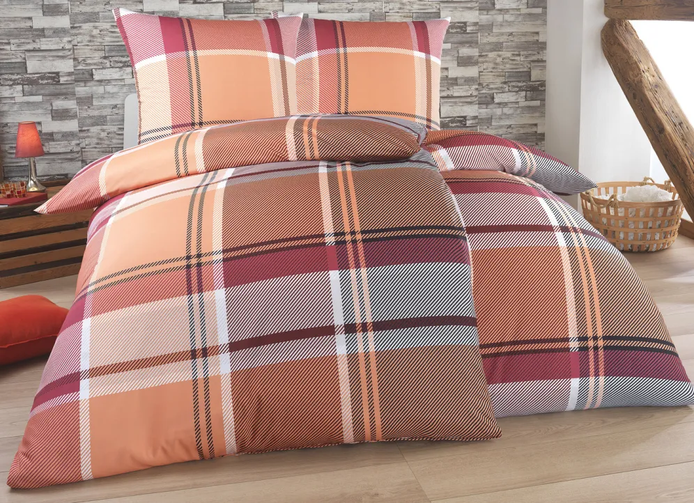 Bettwäsche-Garnitur in Polycotton-Biber-Qualität in Größe 112 (80×80 cm + 135×200 cm) und in Orange-Rot.