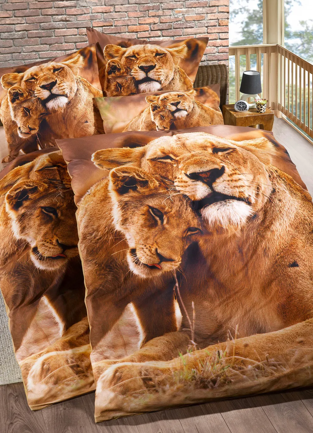 Ein niedliches Löwenjunges kuschelt mit seiner Mutter auf der Vorderseite dieser eindrucksvollen Bettwäsche-Garnitur! Rückseite uni. Mit Reißverschluss.