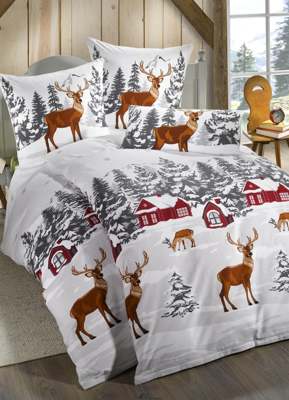 Perfekt für kalte Winternächte ist die kuschelig warme Bettwäsche-Garnitur aus dem Hause Florella, die auf der Vorderseite eine schöne Schneelandschaft mit mehreren Waldbewohnern zeigt.