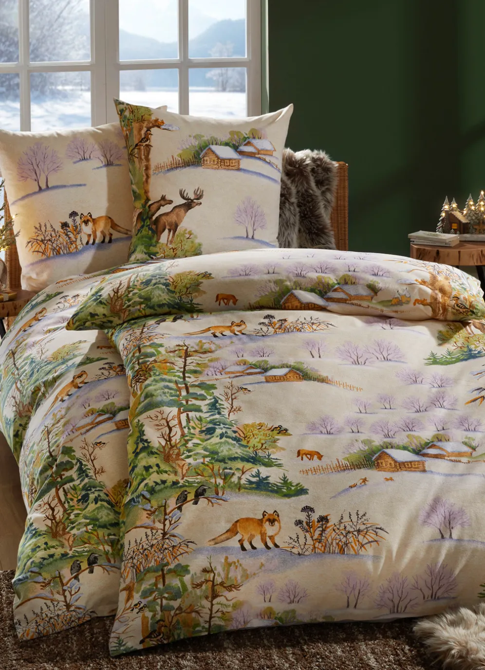 aus dem Hause „Dobnig“ sind allerlei Wald- und Wiesenbewohner in einer stimmungsvoll verschneiten Winterlandschaft zu sehen. Mit Reißverschluss. Die bügelleichte Qualität: Biber aus 100% Baumwolle. Waschbar bis 60 °C und trocknergeeignet.