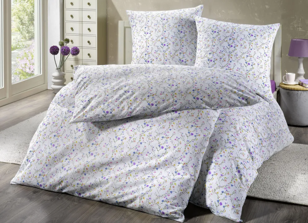 Diese bezaubernde Bettwäsche-Garnitur von „Janine“ besticht durch ihr liebliches Blümchendessin und einen angenehm weichen und hautsympathischen Schlafkomfort. Die bügelfreie Qualität: Mako-Soft-Seersucker aus 100% Baumwolle. Waschbar bis 60 °C und trocknergeeignet.