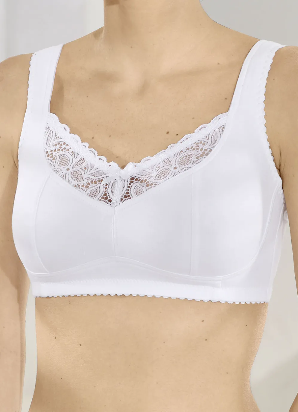 Hautsympathischer, weißer BH mit Elastikspitze am Dekolleté, unterlegtem Vorderteil sowie breiten, weich gepolsterten, verstellbaren Stretchträgern.