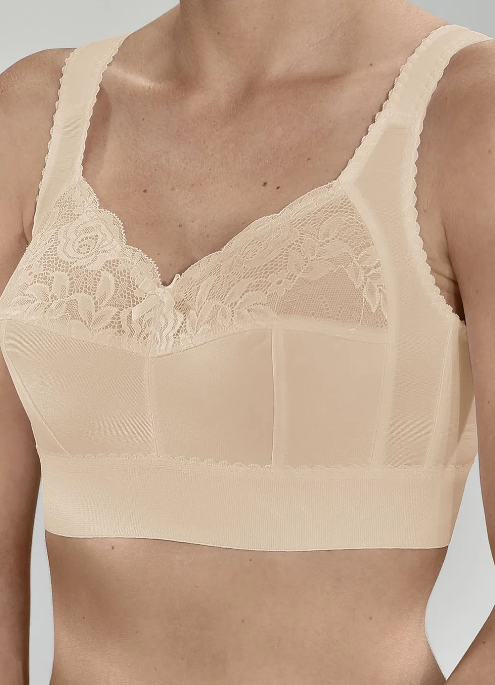 Perfekt formender BH mit unterlegter Elastikspitze in den Obercups, bequemem, extra breitem Unterbrustband sowie im Schulterbereich weich gepolsterten, verstellbaren Stretchträgern.