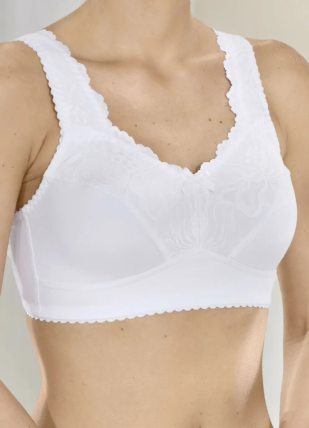 Hautsympathischer BH in Weiß, mit elastischer Spitze im unterlegten Vorderteil sowie breiten, im Schulterbereich weich gepolsterten, verstellbaren Stretchträgern.