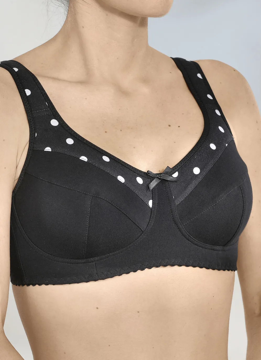 Hautsympathischer, schwarzer BH mit weißem Punktedessin am Dekolleté, unterlegtem Vorderteil sowie im Schulterbereich weich gepolsterten, verstellbaren Stretchträgern.