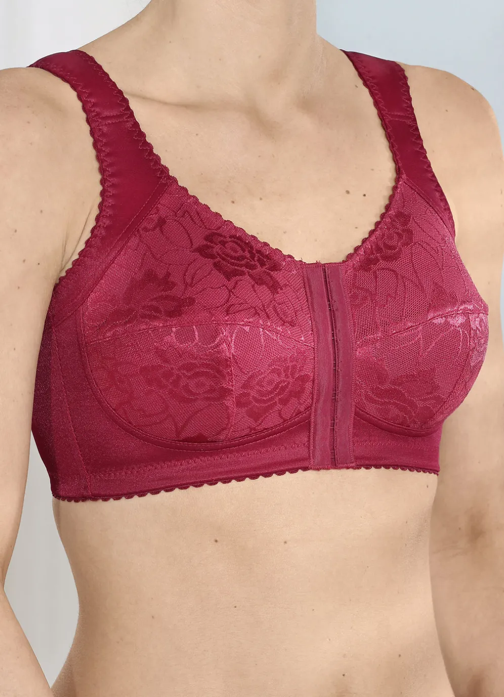 Bordeauxfarbener BH mit unterlegtem Vorderteil, Cups aus elastischer Spitze, praktischem Vorderverschluss sowie breiten, im Schulterbereich weich gepolsterten, verstellbaren Stretchträgern.