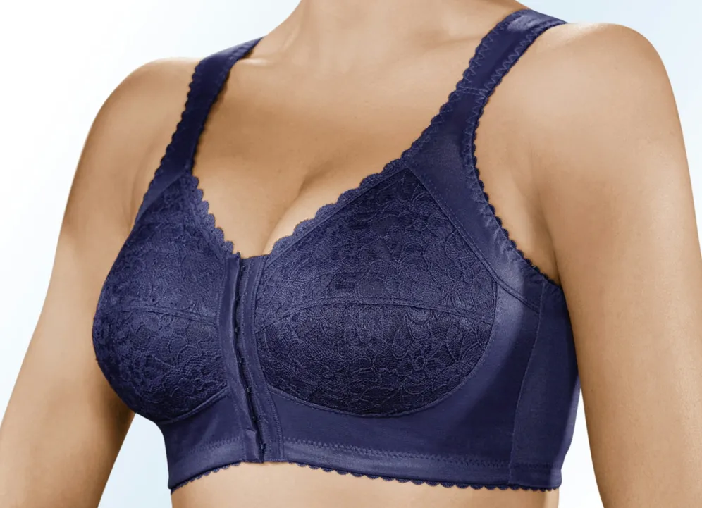 BH mit praktischem Vorderverschluss, Cups aus unterlegter Spitze, weich gepolsterten Untercups, breiten, im Schulterbereich weich gepolsterten Trägern sowie verstärktem Rückteil.