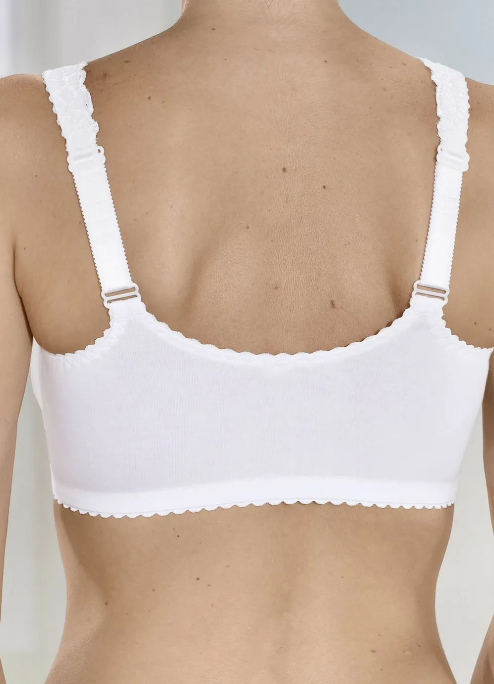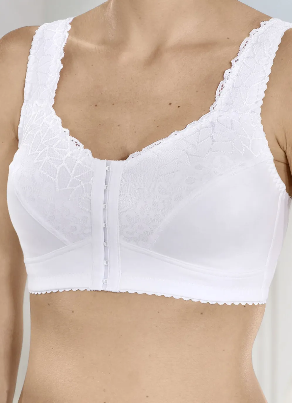 Funktioneller, weißer BH mit praktischem Vorderverschluss, unterlegter Elastikspitze im Vorderteil, seitlicher Cupverstärkung sowie breiten, im Schulterbereich weich gepolsterten, verstellbaren Stretchträgern.