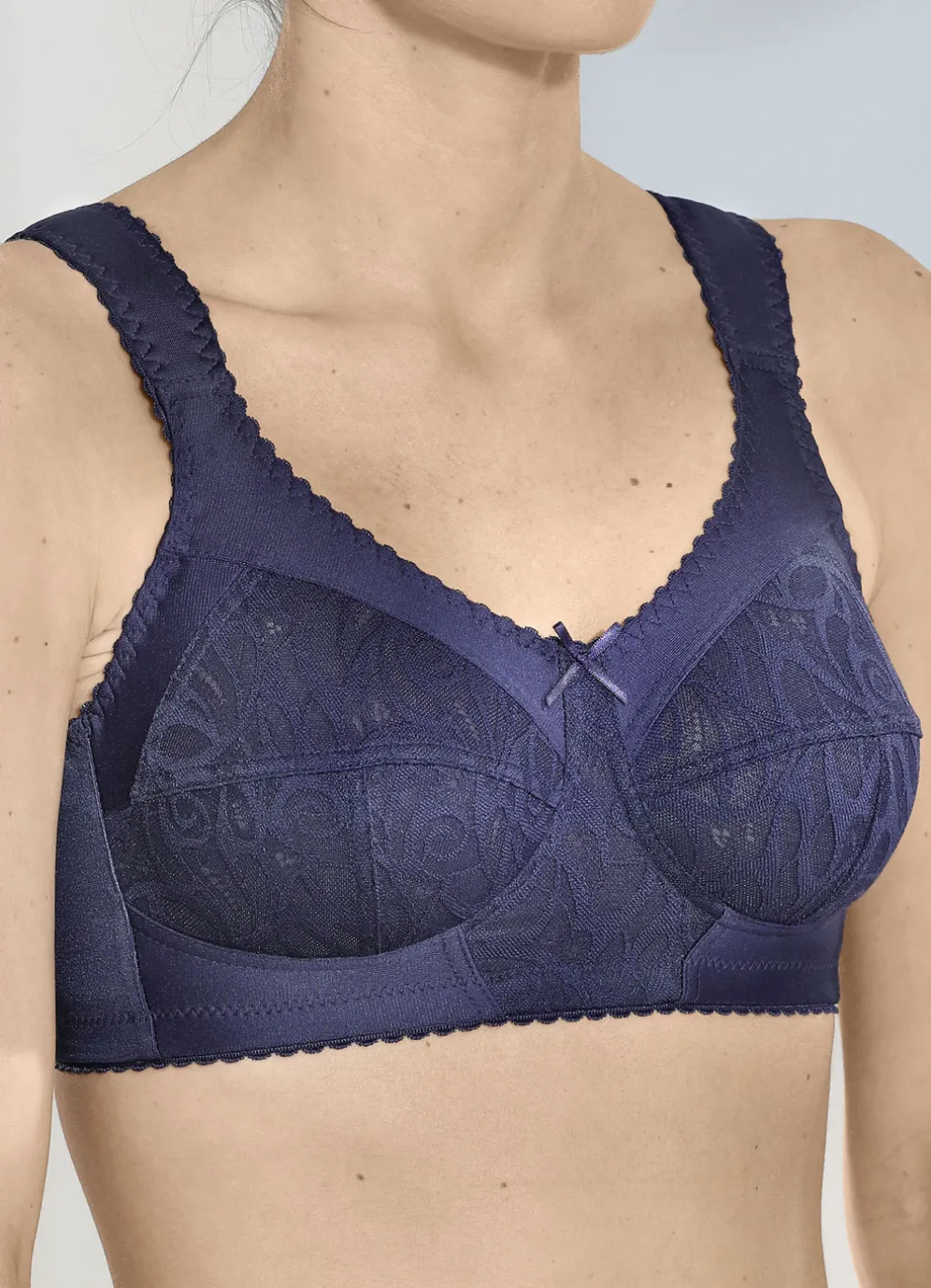 BH in Marine, mit unterlegter Elastikspitze im Vorderteil sowie breiten, im Schulterbereich weich gepolsterten, verstellbaren Stretchträgern.