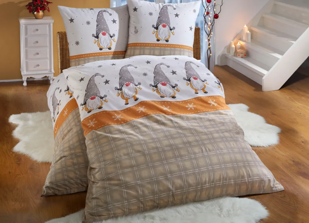 Schmücken Sie Ihren Schlafplatz in der kommenden Weihnachtszeit mit dieser lustigen Garnitur von Bierbaum, die mit putzigen Weihnachtswichteln verziert ist. Mit Reißverschluss. Qualität: Biber aus 100% Baumwolle. Waschbar bis 60 °C und für Trockner geeignet
