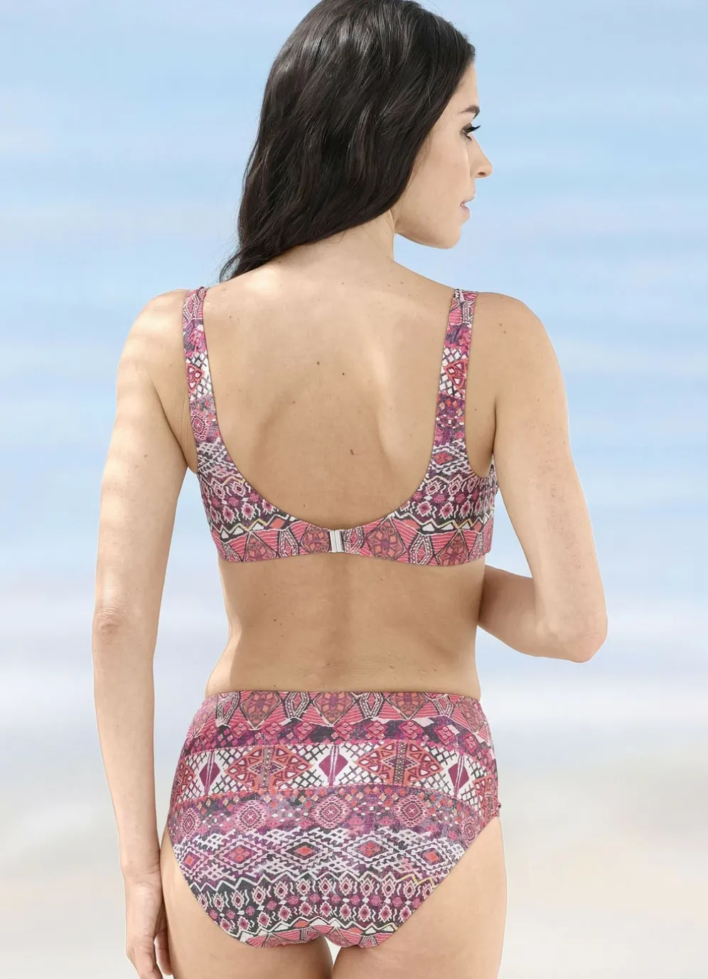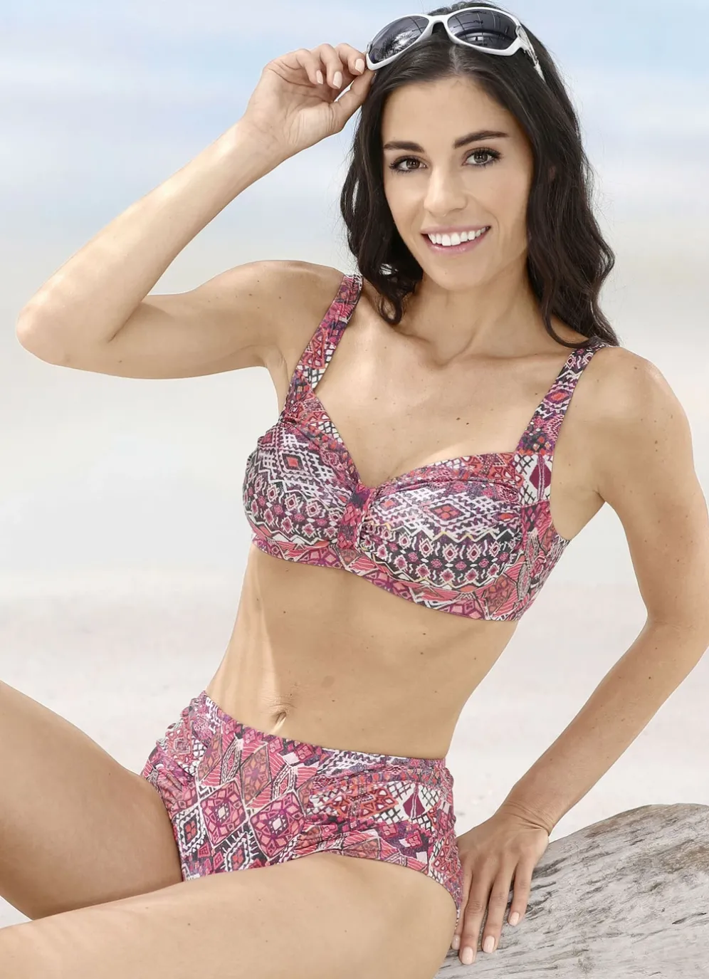 Bikini mit allover Druckdessin in Koralle-Bunt: Oberteil mit Zierschlaufe, Außenträgern, herausnehmbaren Softschalen sowie seitlichen Stützstäbchen. Höher geschnittenes, gerafftes Höschen mit formendem Vorderfutter.