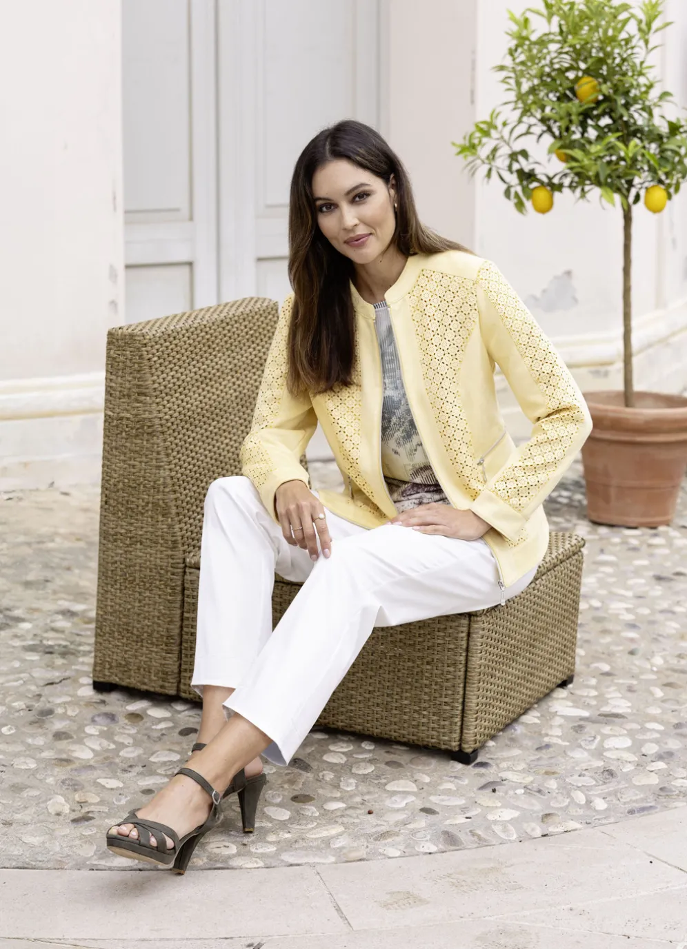 Leicht taillierter Blazer mit Cut-Outs, kleinem Stehkragen am runden Halsausschnitt, Reißverschlussleiste, Taschen mit Reißverschluss sowie geschlitzten Ärmelabschlüssen. Länge ca. 60 cm.