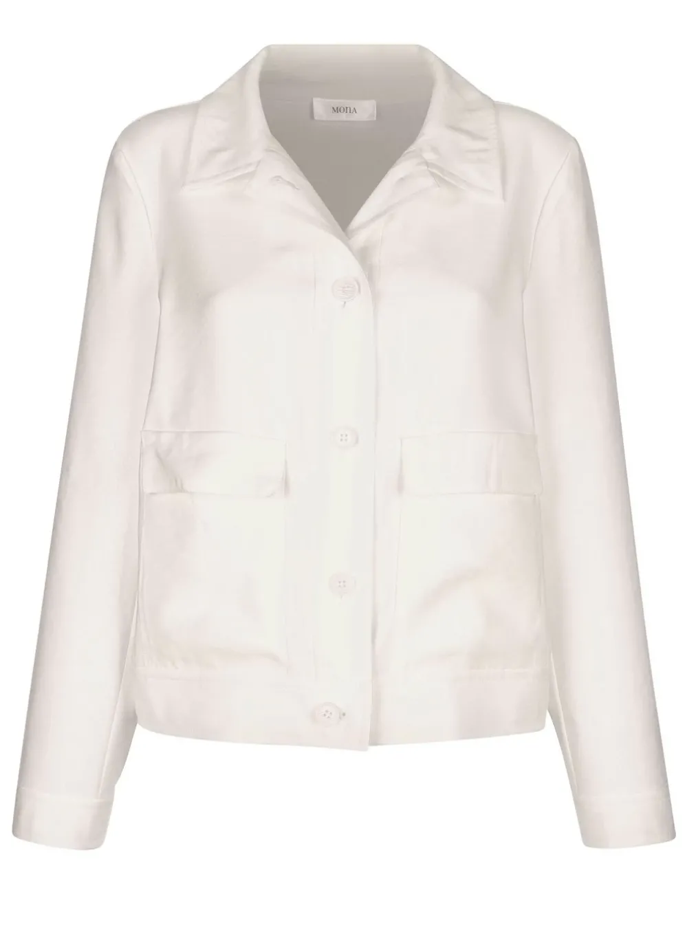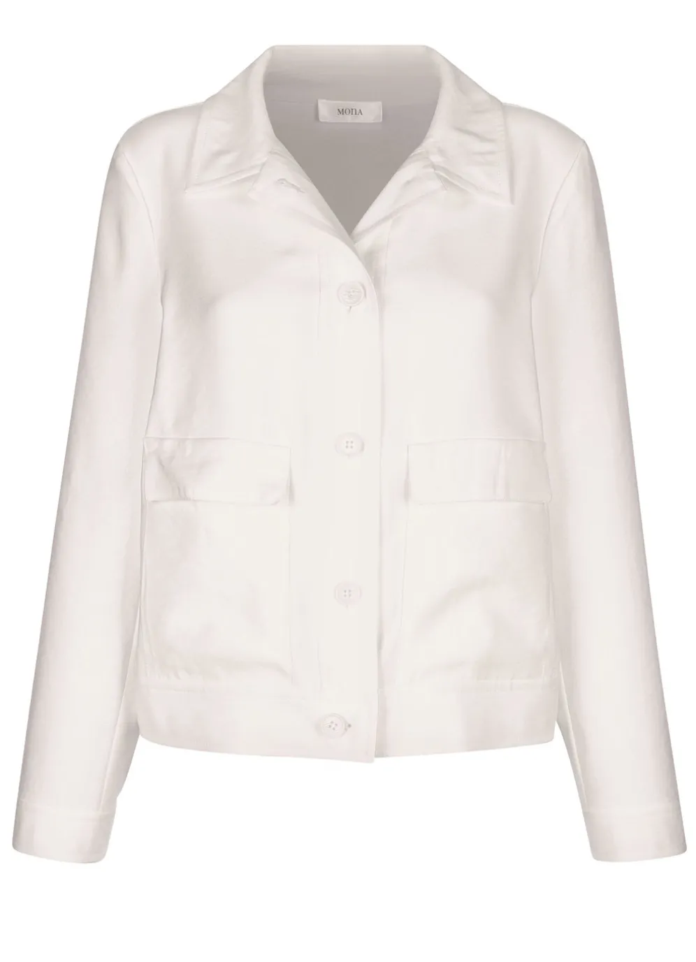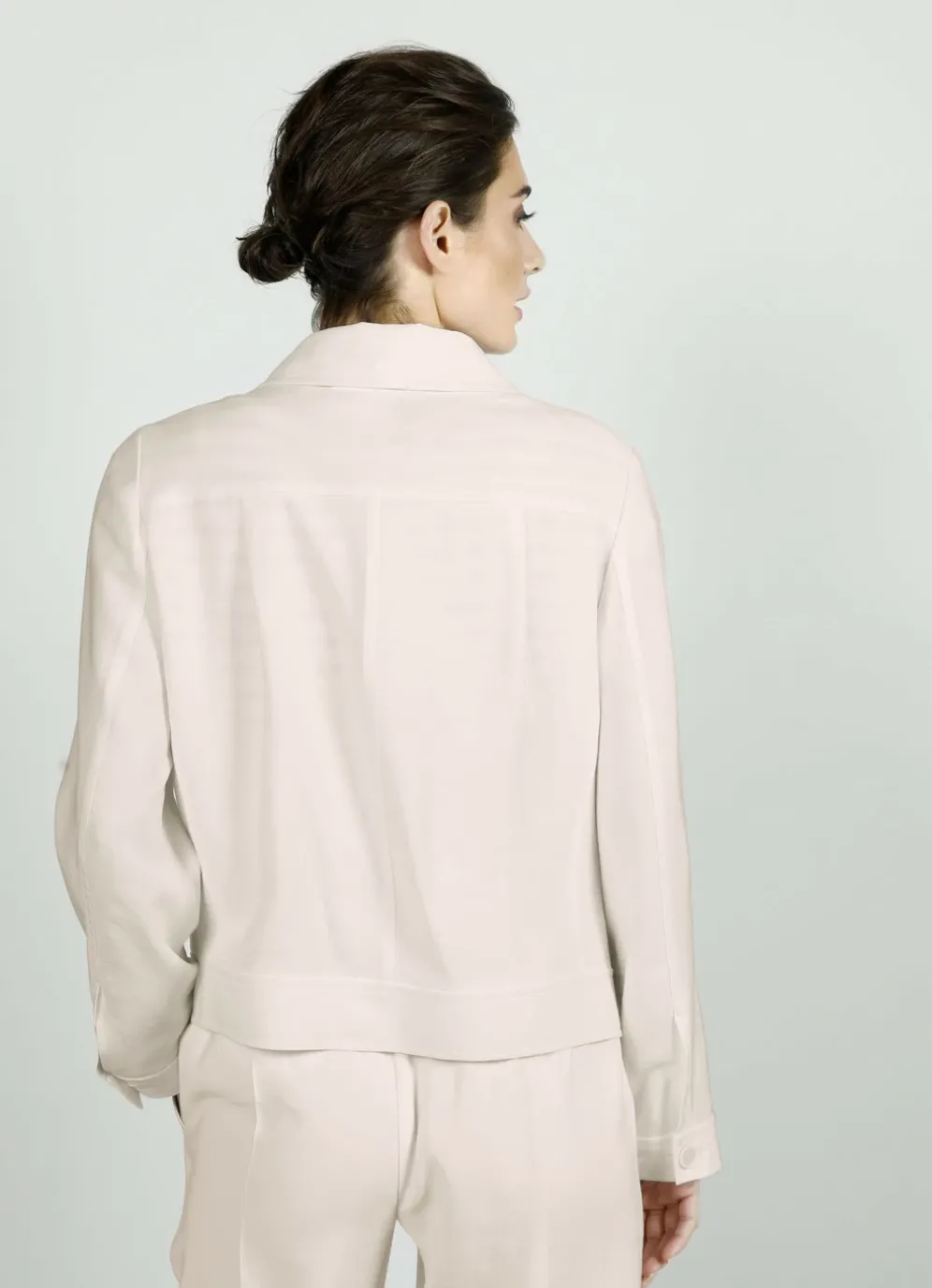 Gerade geschnittener Blazer mit Hemdkragen, Pattentaschen sowie langen Ärmeln mit Knopf und Manschette. Länge ca. 55 cm.