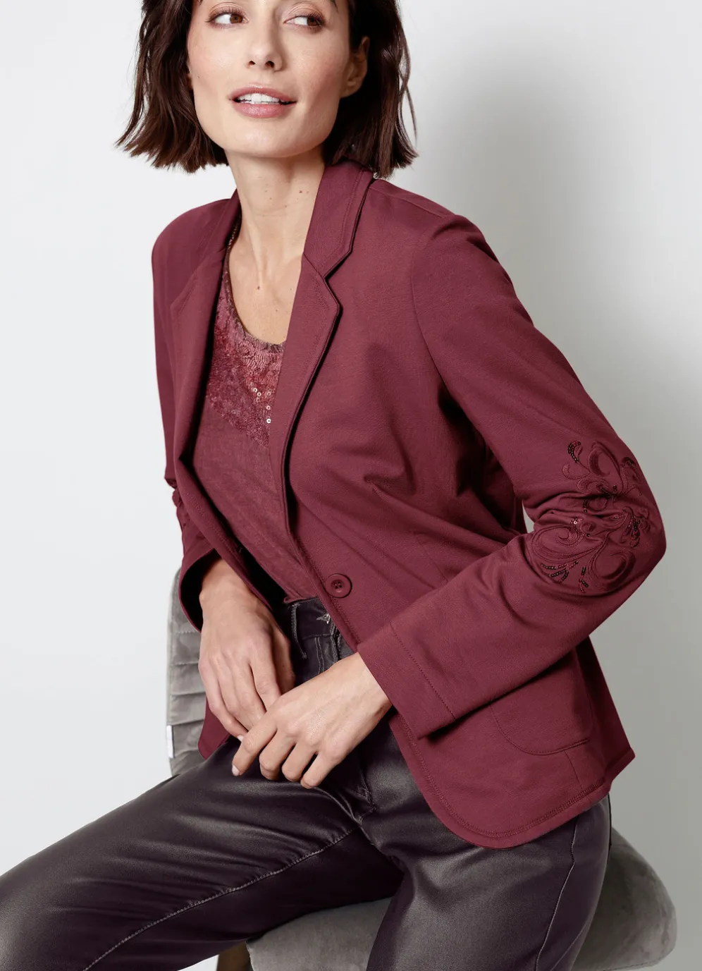 Blazer mit hübscher Stickerei in Weinrot und in Größe 52.