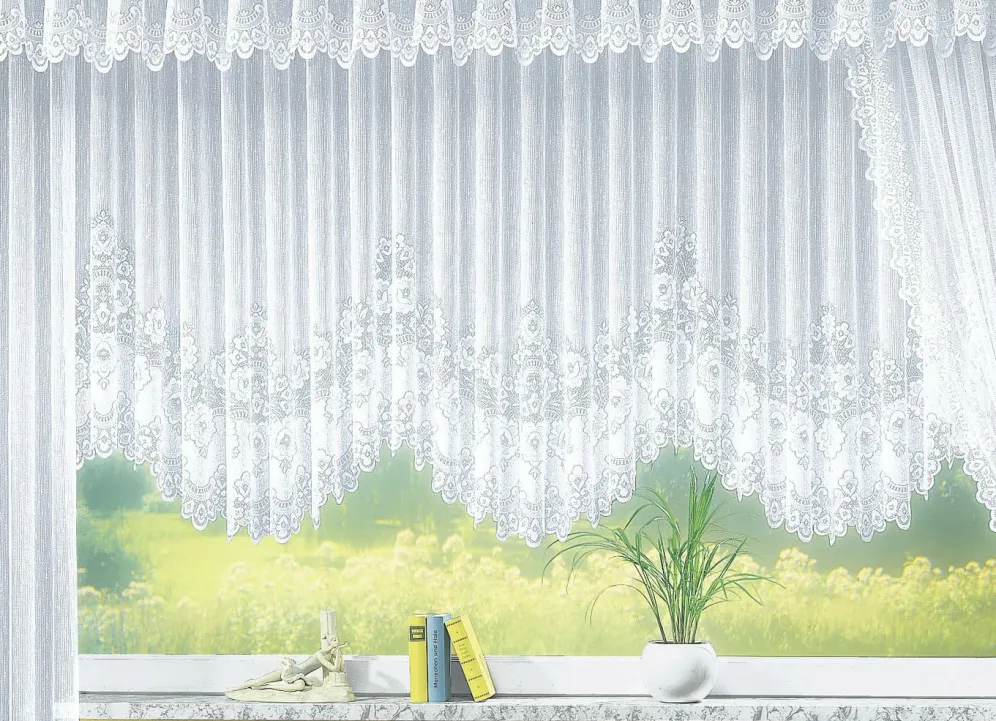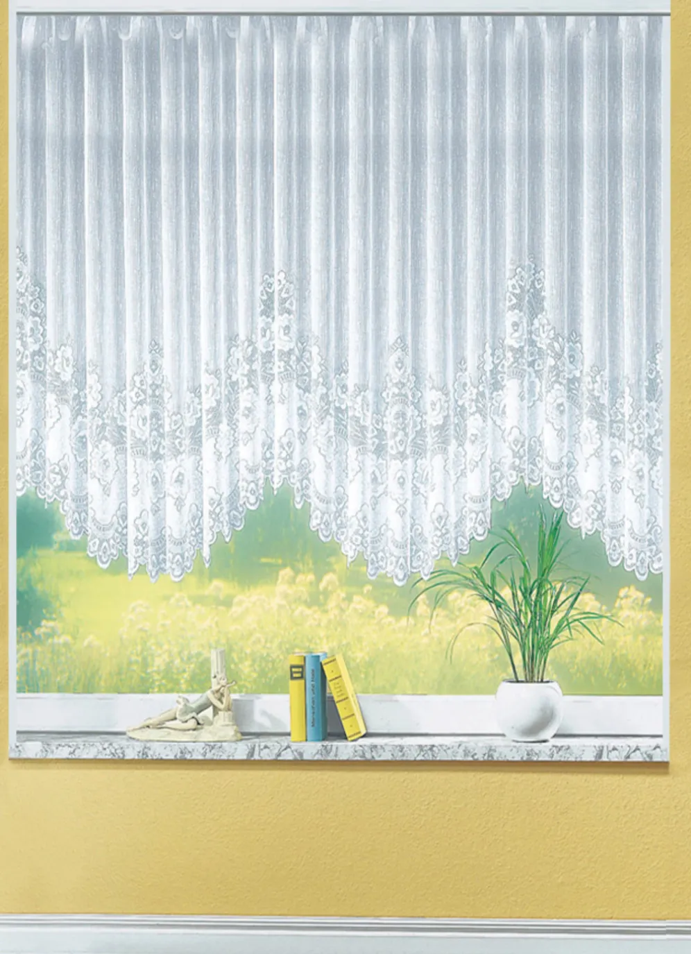 Weißer, dessinierter Blumenfenster-Store, gleichmäßig gebogt. Bogenbreite ca. 150 cm. Mit Faltenband. Bestellen Sie deshalb die 3-fache Leisten/Deko-Breite. 100% Polyester/„Trevira“. Nach Ökotex-Standard 100