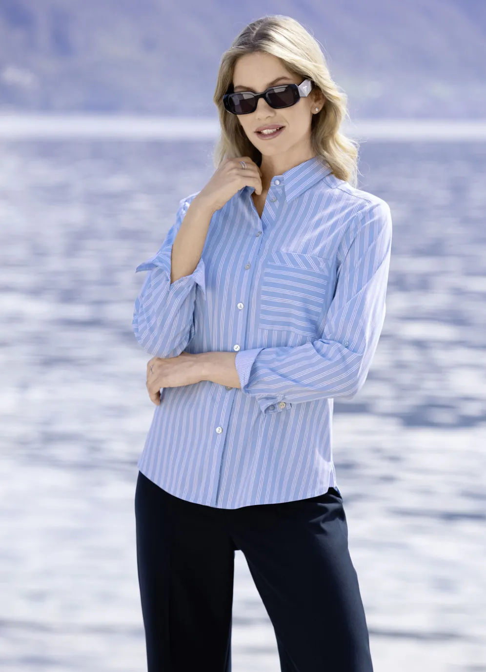 Herrliche Bluse von B/ANCA mit Hemdkragen und Streifen-Dessin allover, langen Ärmeln, Knopfleiste, auf 3/4-Länge krempelbare Manschettenärmel sowie Brusttasche.