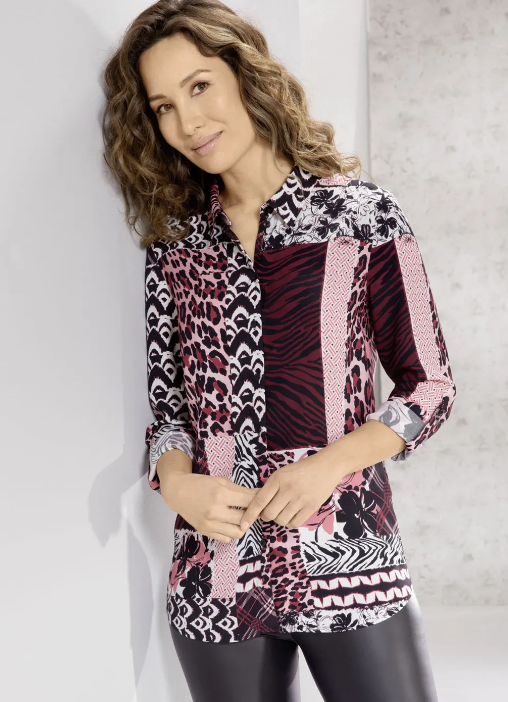 Jedes Teil ein Unikat! Interessante Bluse mit farbbrillantem Inkjet-Druck in Bordeaux-Ecru-Rosé-Bunt, Hemdkragen, Knopfleiste, auf 3/4-Länge krempelbaren, langen Manschettenärmeln mit Riegel und Knopf sowie abgerundetem Saum.