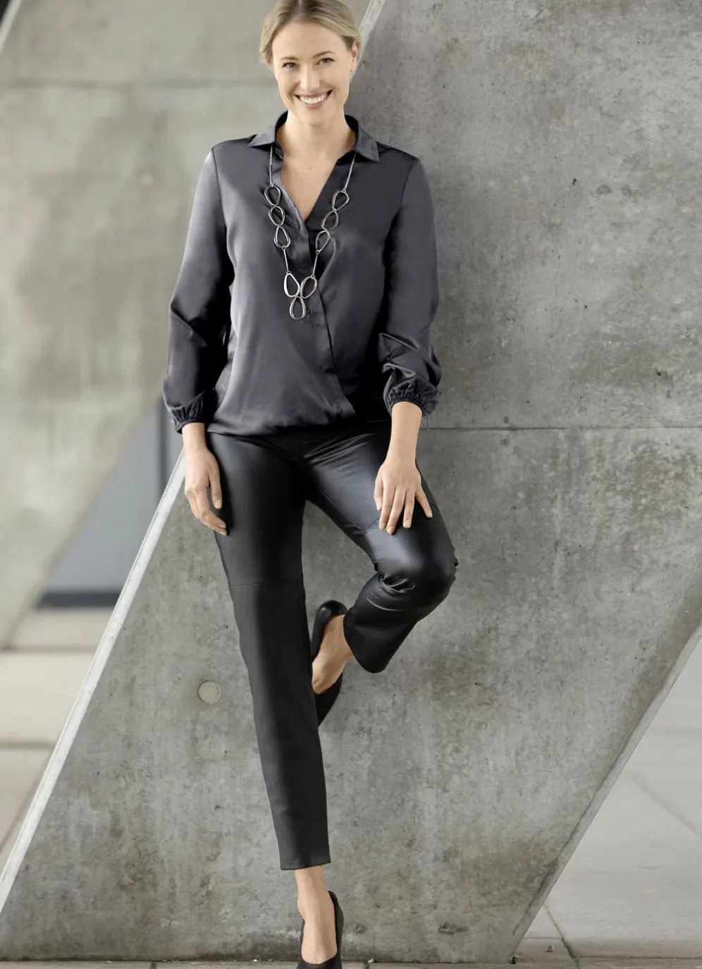 Ein absolutes Highlight ist diese schicke Bluse mit raffinierter Verabeitung und innenliegendem Druckknopf im Vorderteil, Rückenpasse mit Faltenlegung und Gummizug am Saumabschluss sowie an den langen Ärmeln.