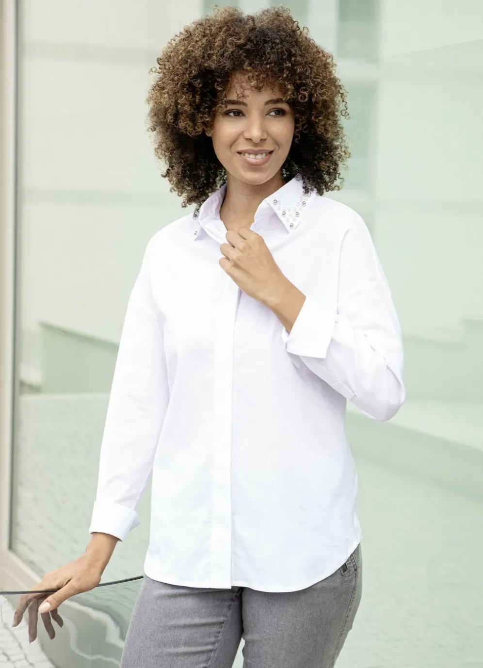 Kombistarke, weiße Bluse mit dekorativer Perlenzier am Hemdkragen, verdeckter Knopfleiste, langen Ärmeln mit breiten Manschetten, Rückenpasse sowie leicht abgerundetem Saum.