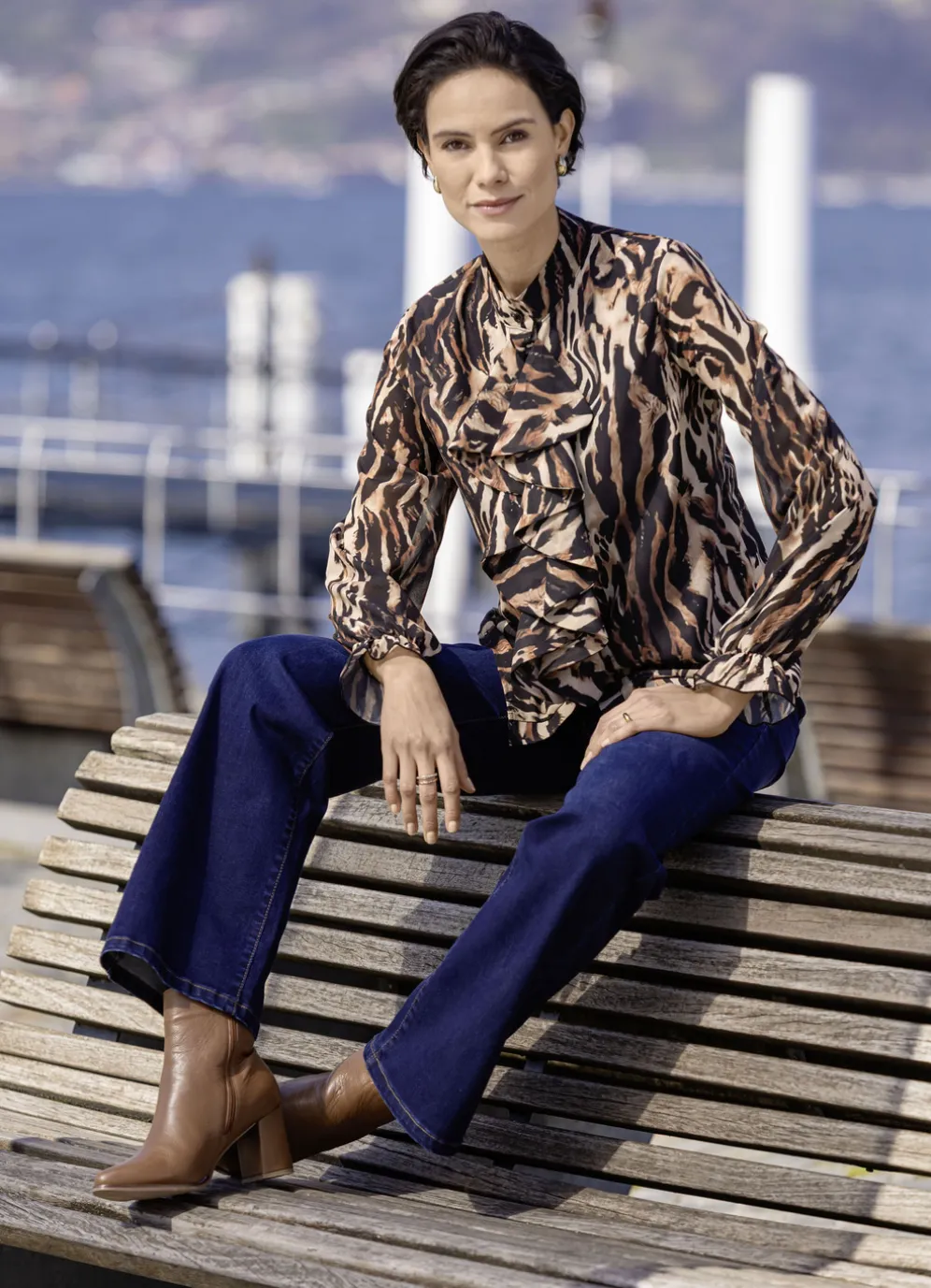 Bluse mit verspielten Volants in Schwarz-Braun-Beige und in Größe 36.