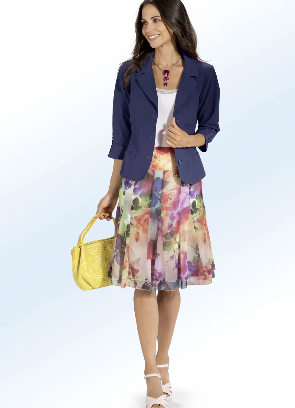 Kombistarker Blusenblazer mit Schulterpolstern, modischem Reverskragen, Knopfleiste, 3/4-langen Ärmeln mit hübscher Fältelung an den Abschlüssen, Wiener Nähten im Vorderteil sowie zwei Taschen.