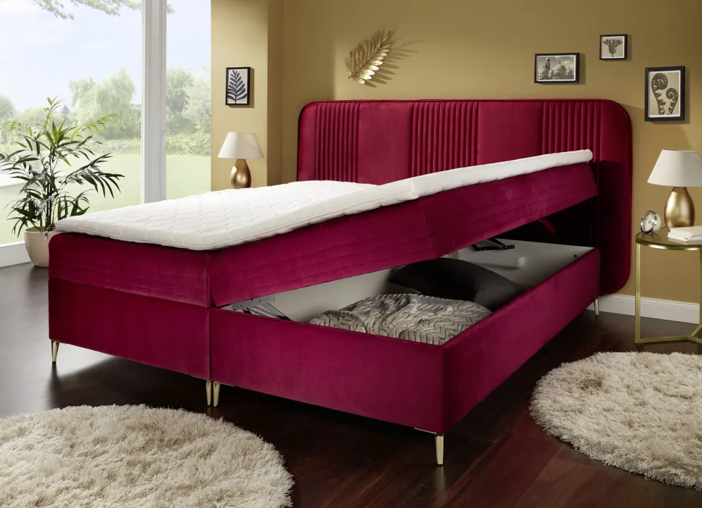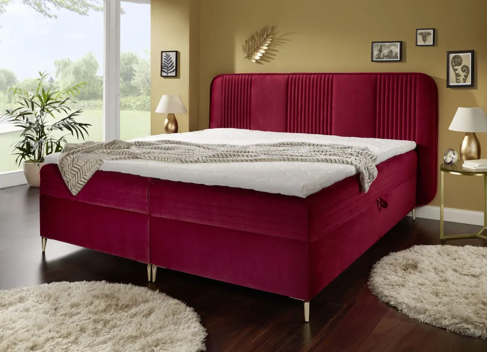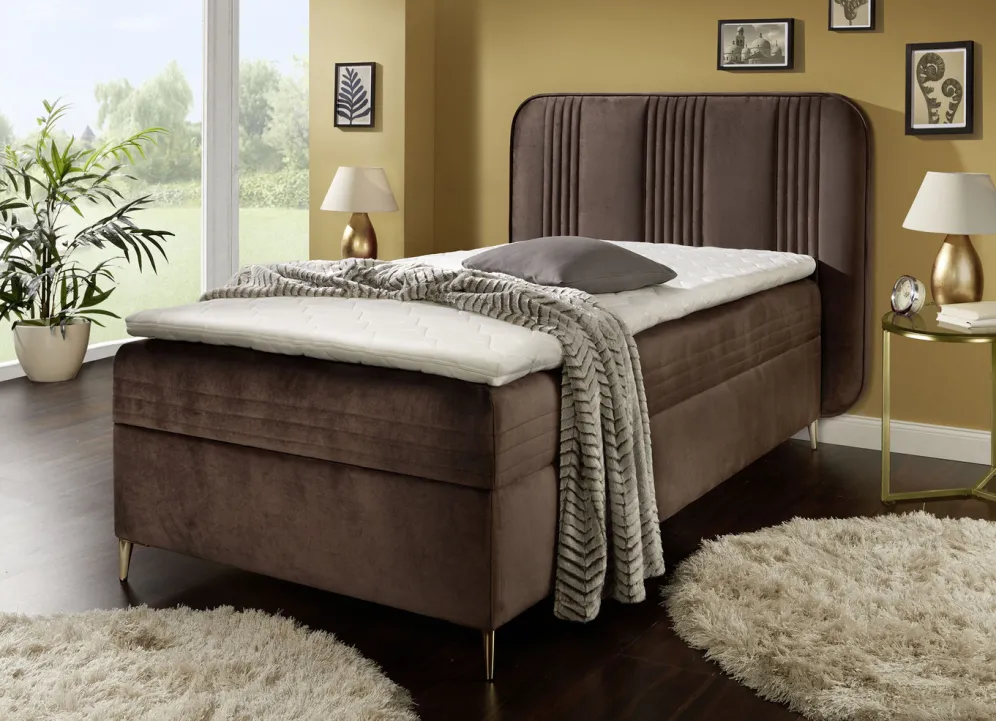 Für ein fantastisches Schlaferlebnis in jeder Nacht sorgt dieses herrlich gemütliche Boxspringbett! Auf stabilem Echtholzgestell gefertigt. Auf der Box liegen eine komfortable, 19 cm hohe Bonnellfederkern-Matratze (Härtegrad 3, belastbar bis 120 kg pro Seite) und ein 5 cm hoher Kaltschaum-Topper. Zusammen sorgen sie für eine optimale Entlastung. Der Bezug des Toppers ist abnehmbar und bei 40 °C waschbar. Rahmen und Kopfteil sind mit angenehmem Samtstoff (100% Polyester) versehen. Das Kopfteil verfügt über eine elegante Steppung. Die 2 geräumigen Bettkästen (seitliche Öffnung, nur 1 Bettkasten bei Liegefläche 100×200 cm) bieten großzügigen Stauraum. Auf goldfarbenen, verchromten Füßen (Höhe 10 cm).