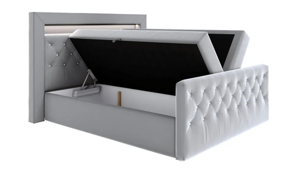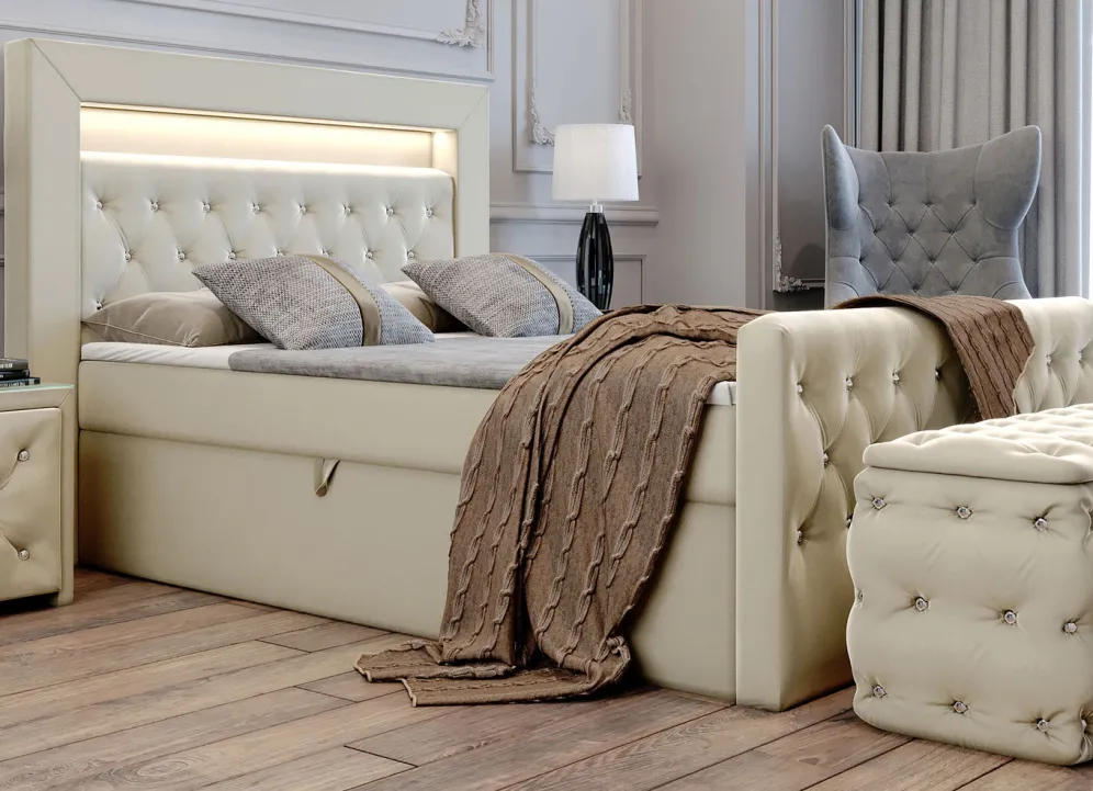 Genießen Sie jede Nacht ein elegantes Schlaferlebnis mit diesem Boxspringbett mit LED-Beleuchtung. Auf stabilem Holzgrundgestell gearbeitet.