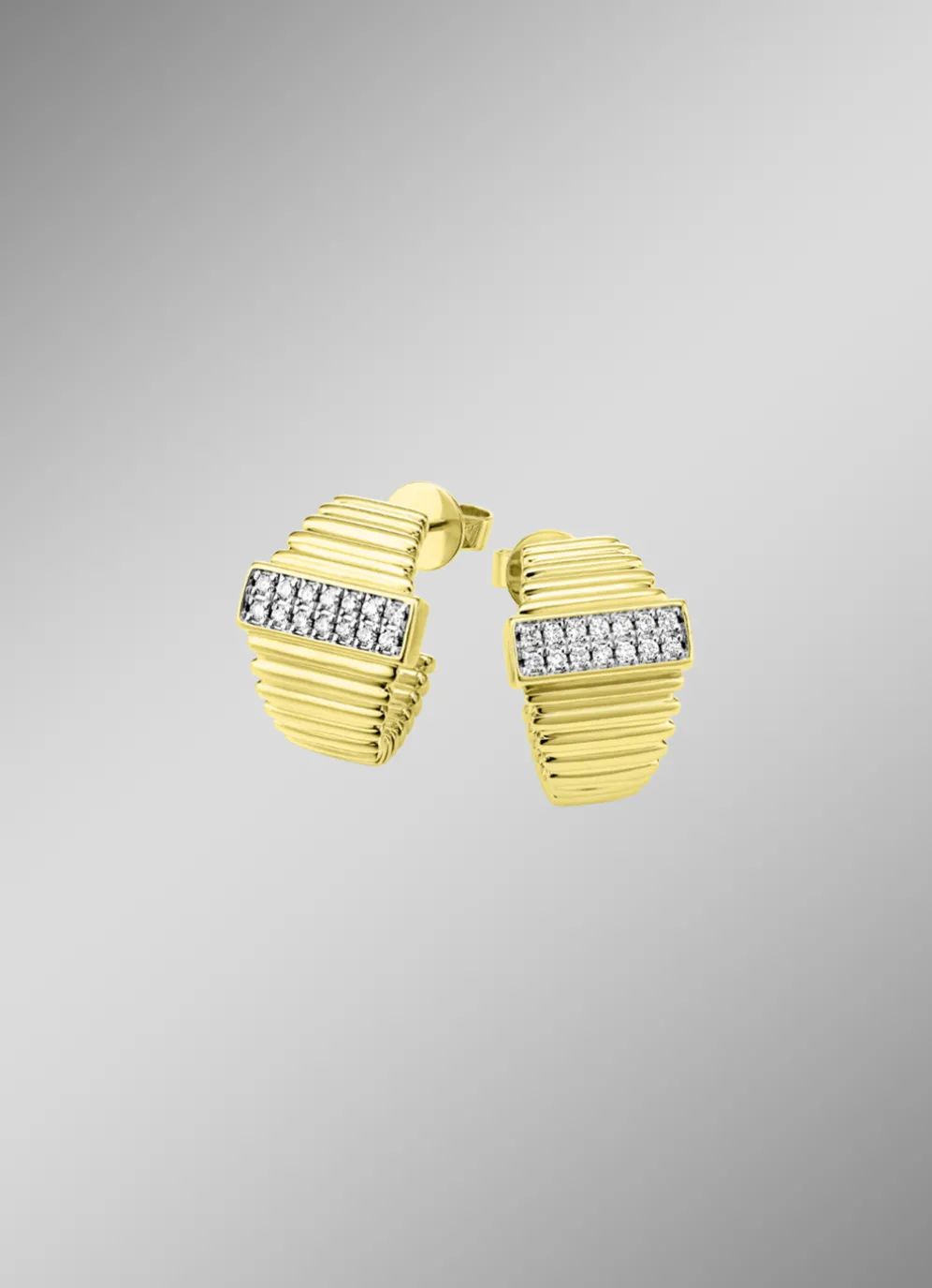 Schönes Design: Brillant-Ohrstecker in Gold 585/- fein. 28 weiße Brillanten, zusammen ca. 0,22 ct. in Piqué 2 Qualität. 16 mm lange funkelnde Ohrstecker mit horizontalen, gleichmäßigen Rillen. In der Mitte zieren 28 Brillanten den Ohrschmuck.