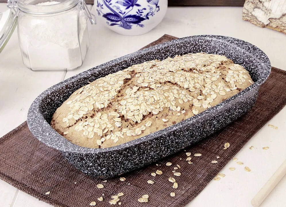 Brotbackform in Granit-Optik. Mit 4-facher Antihaftbeschichtung. Kein Anhaften und Anbrennen. Hitzebeständig bis 250 °C. Ideal als Brotback-, Brat- und Auflaufform mit Deckel.