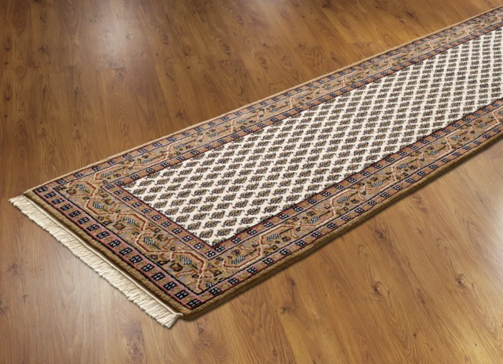 Brücke und Teppiche aus 100% Schurwolle in Größe 111 (Brücke, ca. 60x 90 cm) und in Camelgrundig.