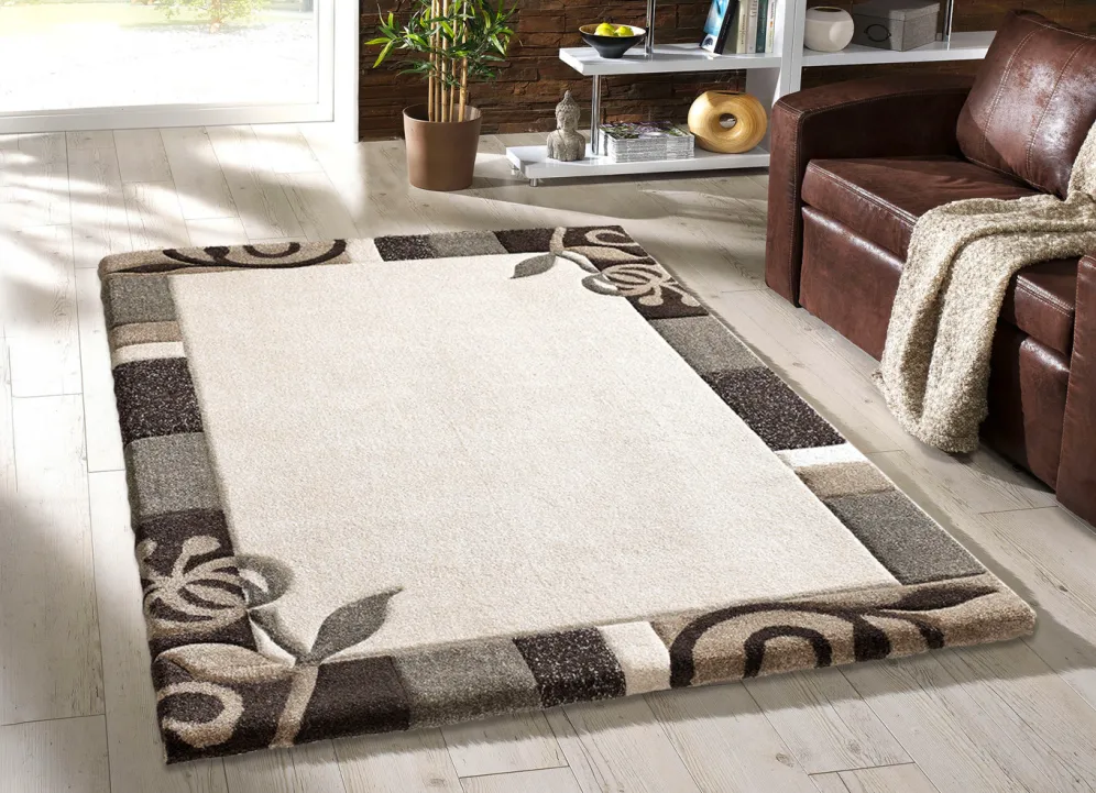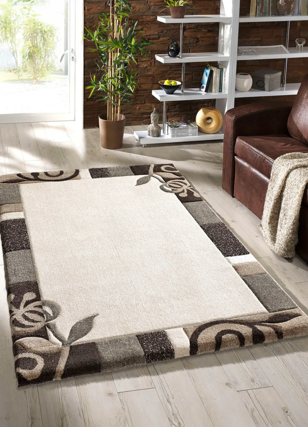Diese Brücken und Teppiche haben eine wunderschöne Bordüre mit Blumen-Motiven und verspielten Elementen – die durch den handgeführten Konturenschnitt besonders hervorgehoben werden. Florhöhe 12 mm. Qualität: 100% Polypropylen/ Heatset-veredeltes Frisé-Garn. Für Fußbodenheizung geeignet.