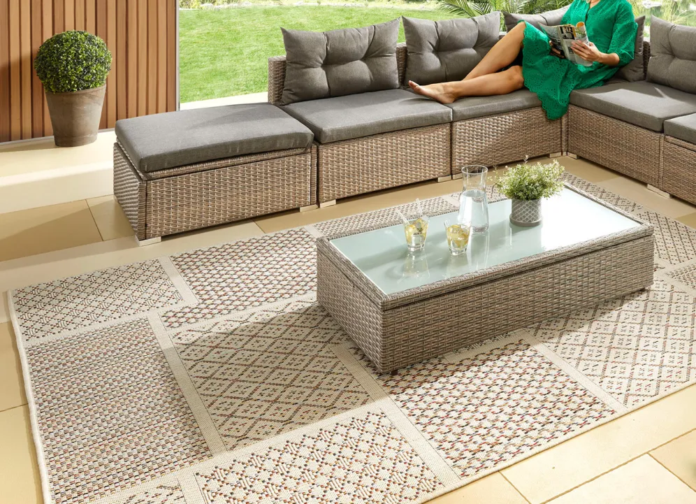 Ob drinnen oder draußen: Diese strapazierfähigen und pflegeleichten Brücken und Teppiche eignen sich perfekt für den Balkon, Ihre Terrasse oder den Garten und sind gegen alle Wetterlagen gewappnet. Aber auch in Ihrem Wohnbereich sorgen sie für Gemütlichkeit. Bei stärkerer Verschmutzung ist eine zusätzliche Reinigung mit Wasser möglich. Gesamthöhe: 5 mm. Qualität: Flachgewebe aus 100% Polypropylen. Für Fußbodenheizung geeignet