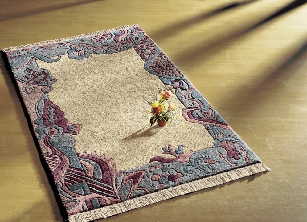 Handgeknüpft: Der Flor des Teppichs wird von Hand in das Grundgewebe eingelegt und – nach alter Tradition – mit den Kettfäden verknüpft. Geringe Abweichungen in Farbe, Dessin oder Größe sind Zeichen für echte Handarbeit.