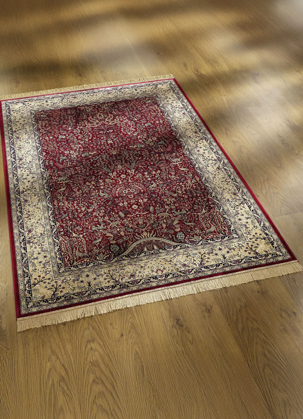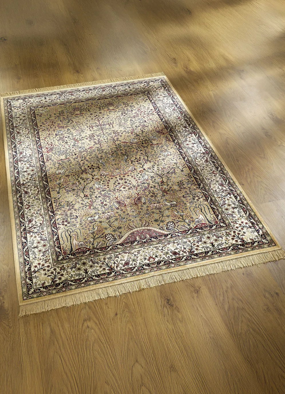 Ein außergewöhnliches, detailreiches und prachtvolles Dessin zeigen diese Brücken und Teppiche im Stil der persischen Isfahan-Provenienz. Die feine Zeichnung ermöglicht die äußerst klare Darstellung der einzigartigen figürlichen Motive auf dem floralen Blumengrund, welche von einer harmonischen Bordüre vortrefflich eingerahmt werden.