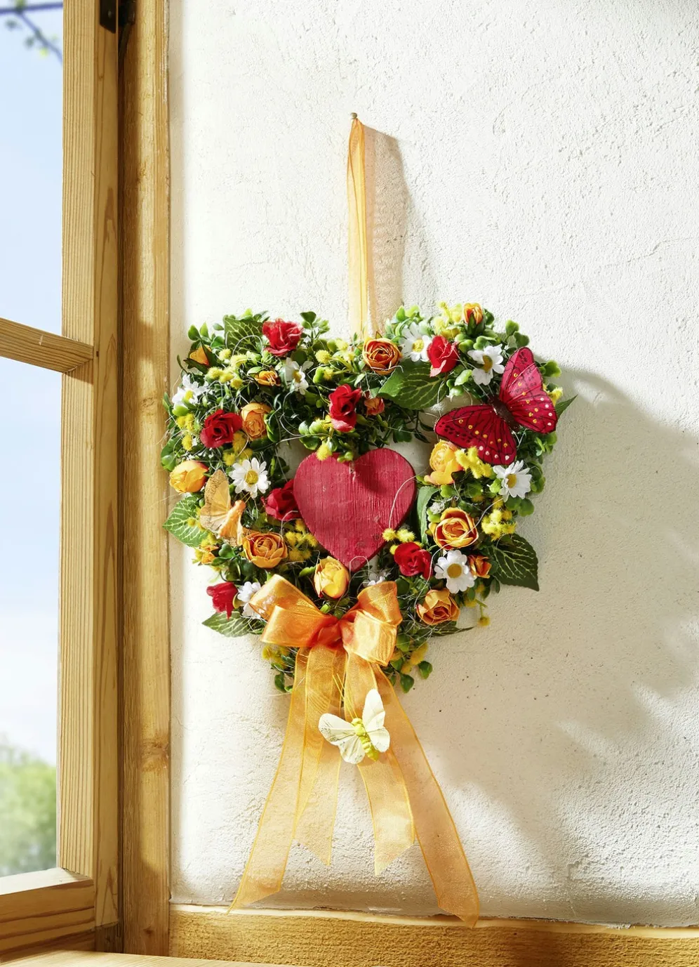 Dieses bezaubernde Buchsbaumherz mit Holz-Herz in der Mitte ist mit orangefarbenen und roten Röschen sowie Schmetterlingen verziert. Mit passendem Textilschleifenband. Aus Kunst- und Textilmaterial gefertigt.