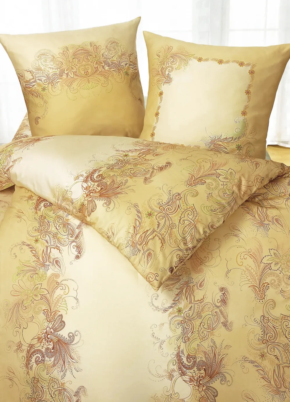 Das leicht orientalisch angehauchte Dessin dieser Bettwäsche-Garnitur und der in sanften Farbverläufen gestaltete Grund zaubern eine schöne Stimmung in Ihr Schlafzimmer. Mit Reißverschluss.