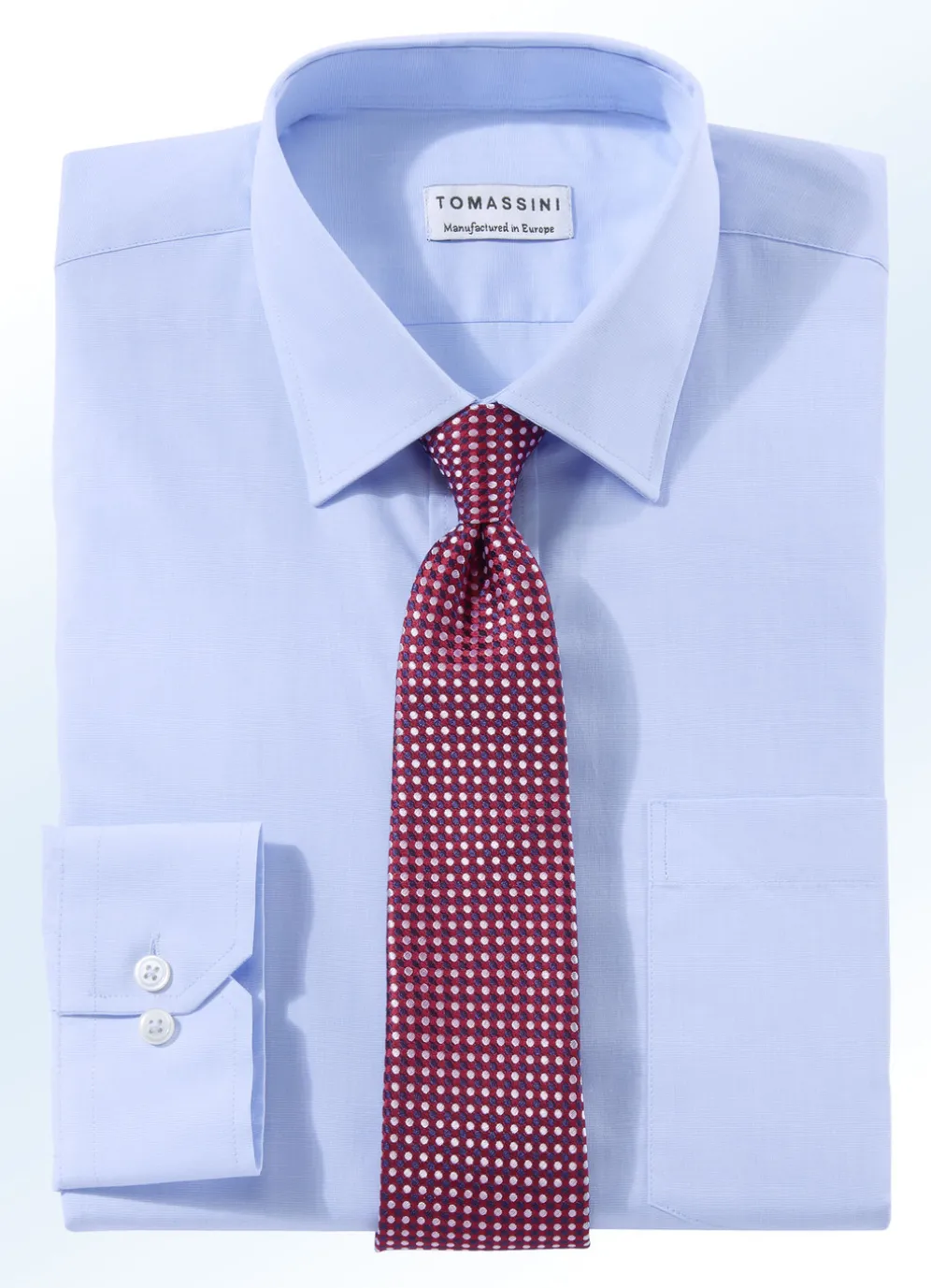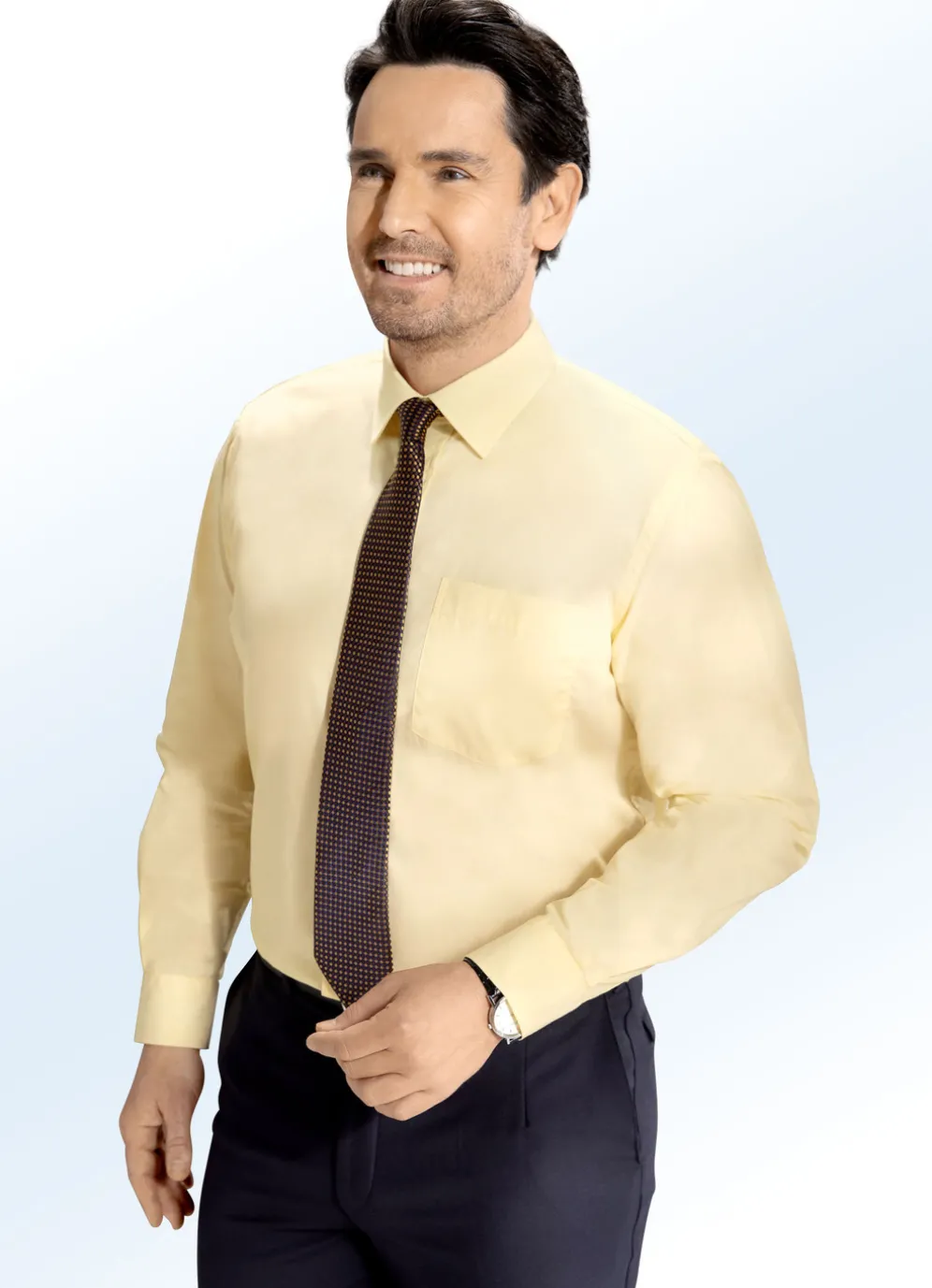 Edles Hemd mit Brusttasche, Ärmelschlitzbesatz, Kombimanschetten sowie Rückenpasse mit seitlich eingelegten Falten.