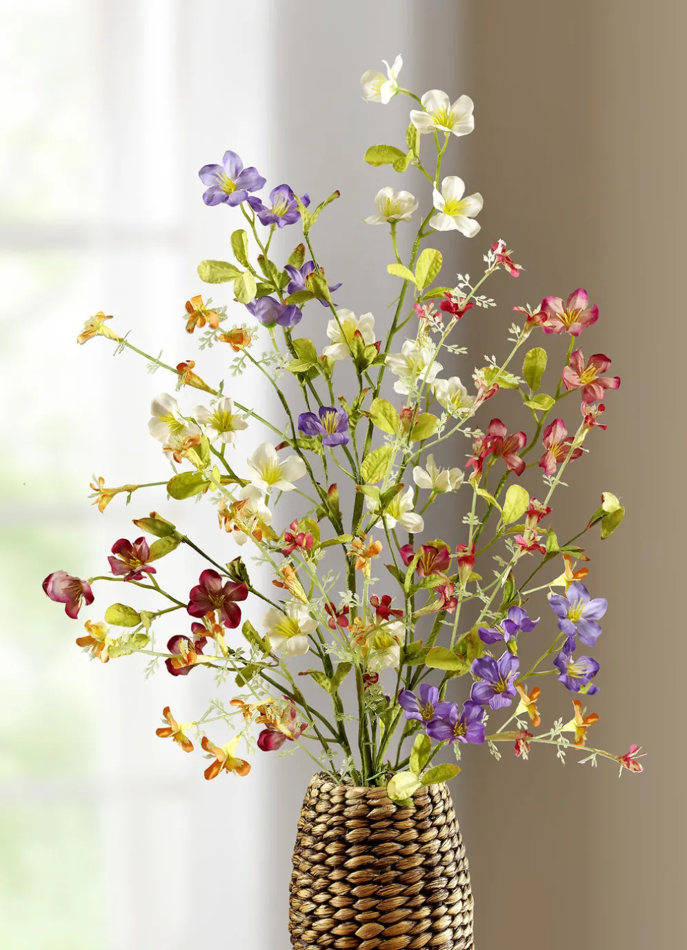 Er wirkt, als hätten Sie ihn von einer Blumenwiese mitgebracht, welkt aber nicht. Dieser wunderschöne Zweig mit vielen bunten Blüten ist aus Kunst- und Textilmaterial hergestellt. Lieferung ohne Vase.