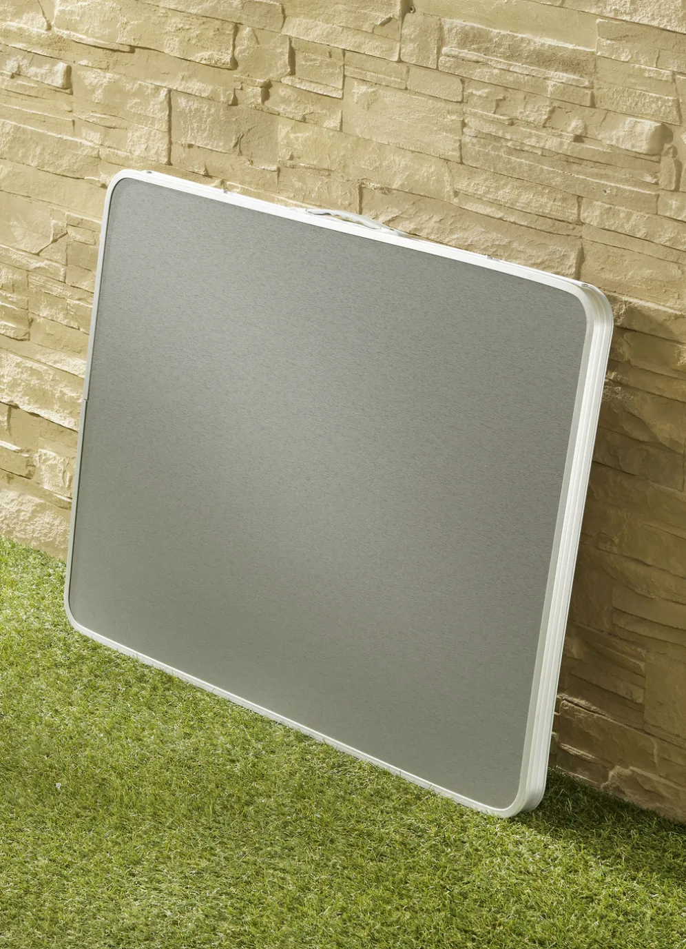 Praktischer Campingtisch mit seitlichen Ablageflächen. Perfekt auch als Grilltisch nutzbar. Die Tischflächen sind aus Kunststoff gefertigt und haben einen umlaufenden Kantenschutz aus Aluminium. Das stabile Gestell beseht aus pulverbeschichtetem Stahl. Der Tisch ist innen und außen einsetzbar und bei Nichtgebrauch platzsparend klappbar. stabile Gestell beseht aus pulverbeschichtetem Stahl. Der Tisch ist innen und außen einsetzbar und bei Nichtgebrauch platzsparend klappbar. Mit Tragegriff.
