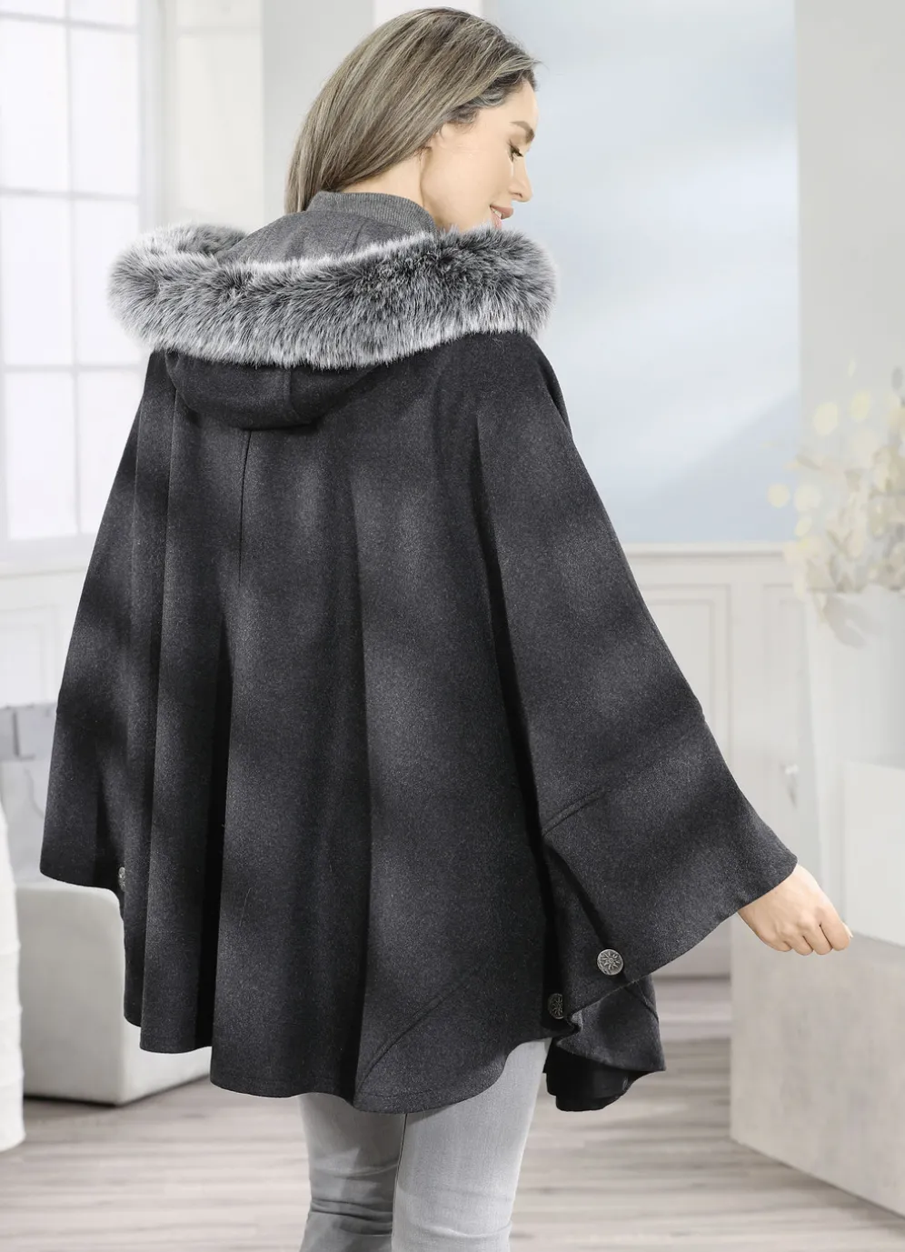 Ihr neuer, stylischer Modebegleiter wird dieses anthrazitfarbene Cape werden: feste Kapuze mit Durchzugsband, Stopper, Flanell-Innenausstattung und abnehmbarem Kunstpelz-Besatz, Knopfleiste, Schubtaschen mit Blende, seitliche Knöpfe sowie eine Innentasche. Länge ca. 85 cm.