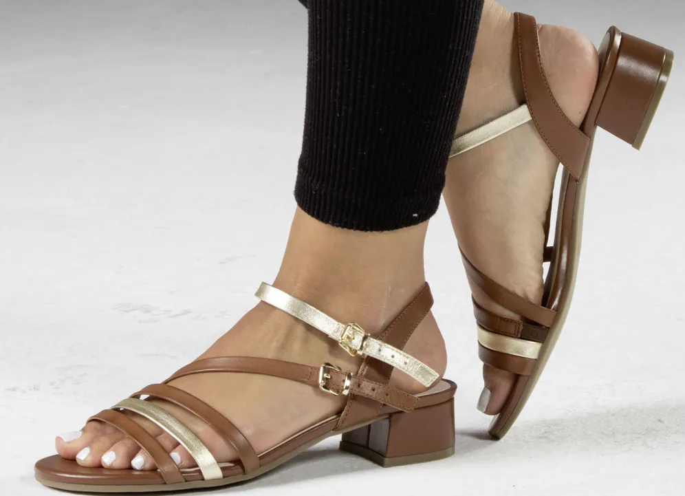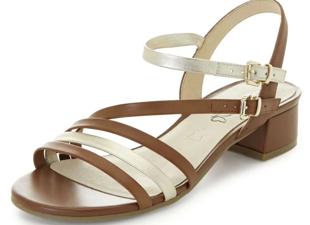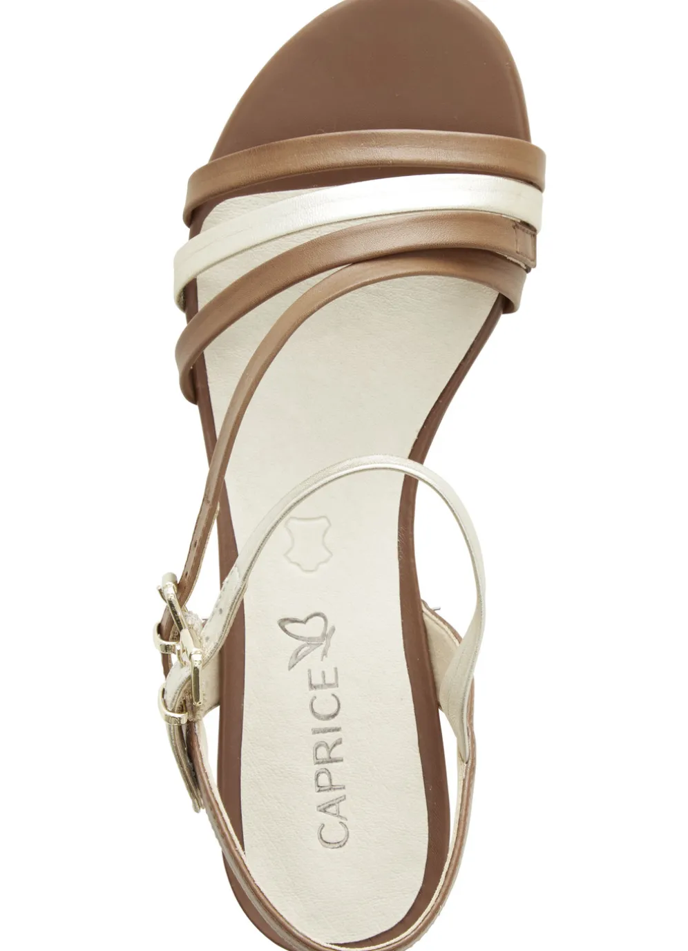 Caprice Sandalette aus teilweise metallisiertem Nappaleder in Schuhgröße 7 1/2 und in Cognac-Gold.