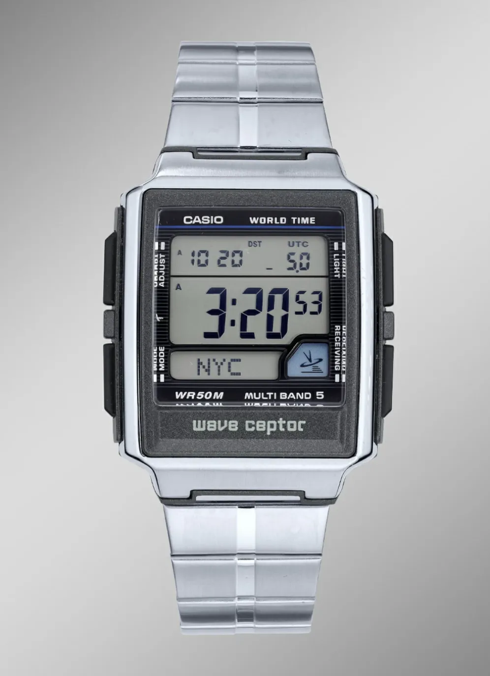 Casio-Funk-Chronograph Wave Ceptor mit Gehäuse aus Kunststoff und mit einem Uhrenband aus Edelstahl.
