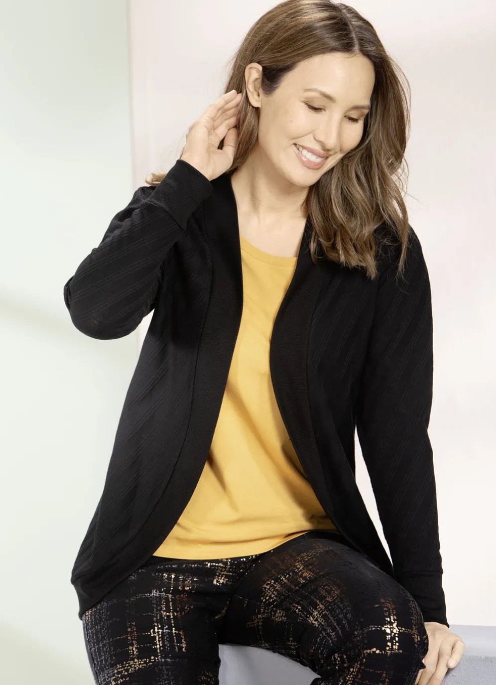 Einfach toll zu kombinieren ist dieses verschlusslose, schwarze Chasuble mit Rippen-Jersey an der Leiste und an den Abschlüssen der langen Ärmeln sowie am Saumabschluss.